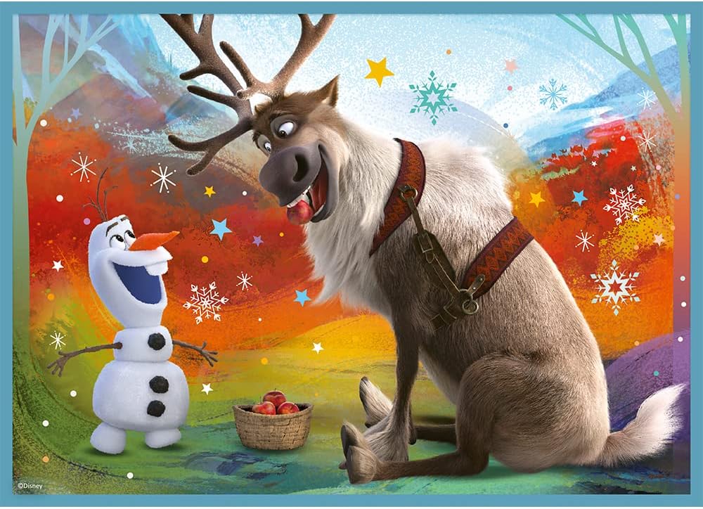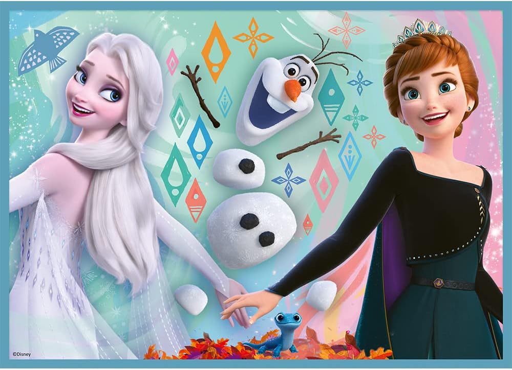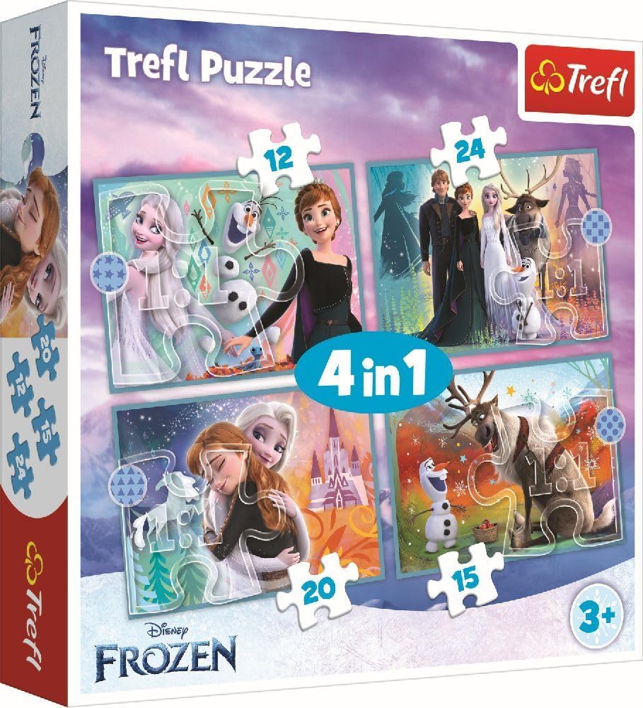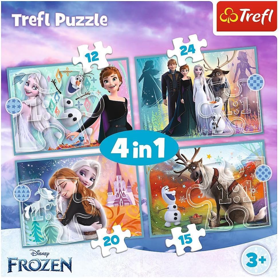 مجموعة بازل أطفال مستوحاة من فيلم فروزن، تحتوي على 4 بازل بمستويات صعوبة مختلفة (12، 15، 20، 24 قطعة) لتناسب مراحل عمرية متعددة. من إنتاج Trefl بجودة عالية وألوان واضحة لشخصيات إلسا وآنا وأولاف وكريستوف وسفين. تساعد على تنمية التركيز والتدرّج في التعلم والمهارات الحركية الدقيقة. مناسبة للأطفال من عمر 3 سنوات فأكثر.