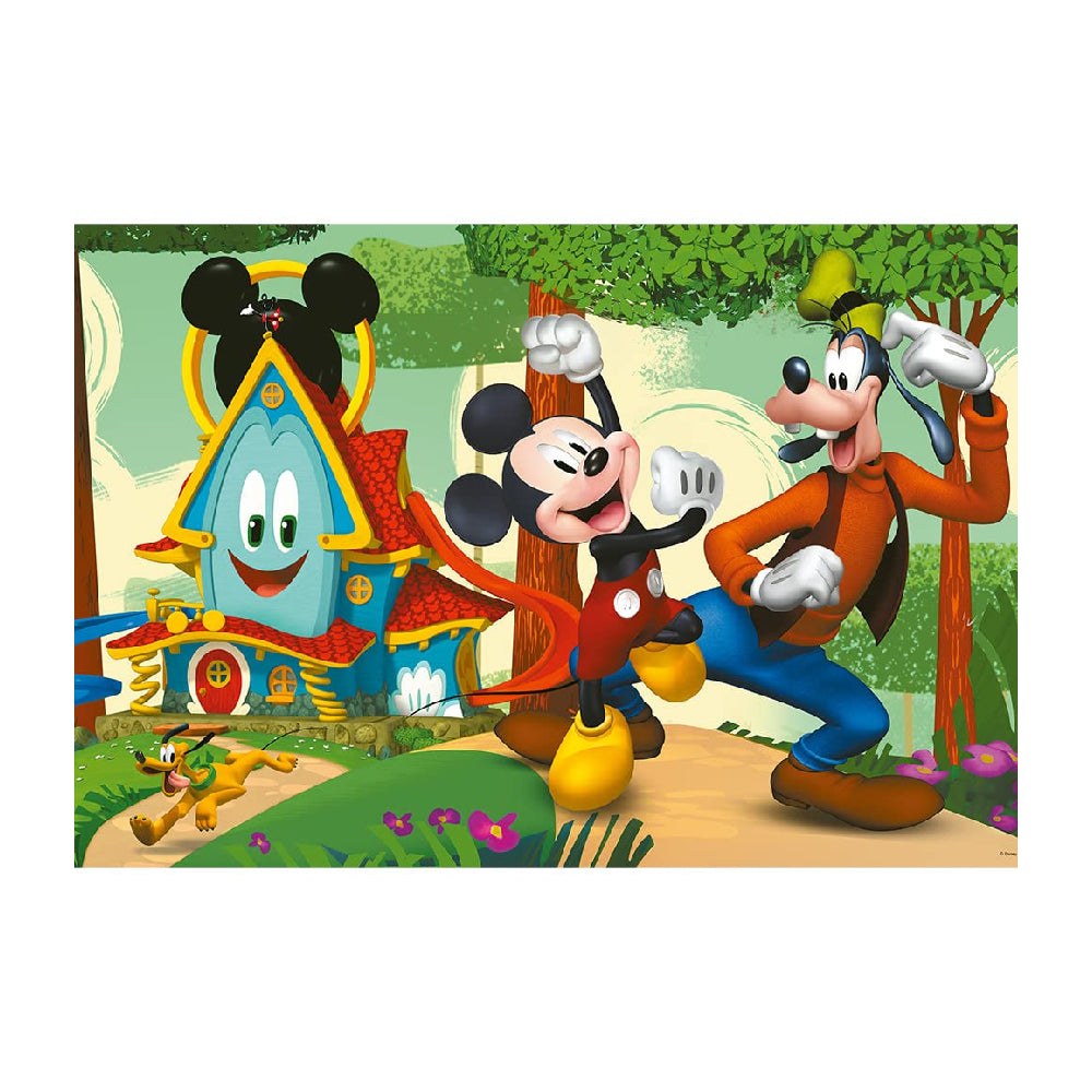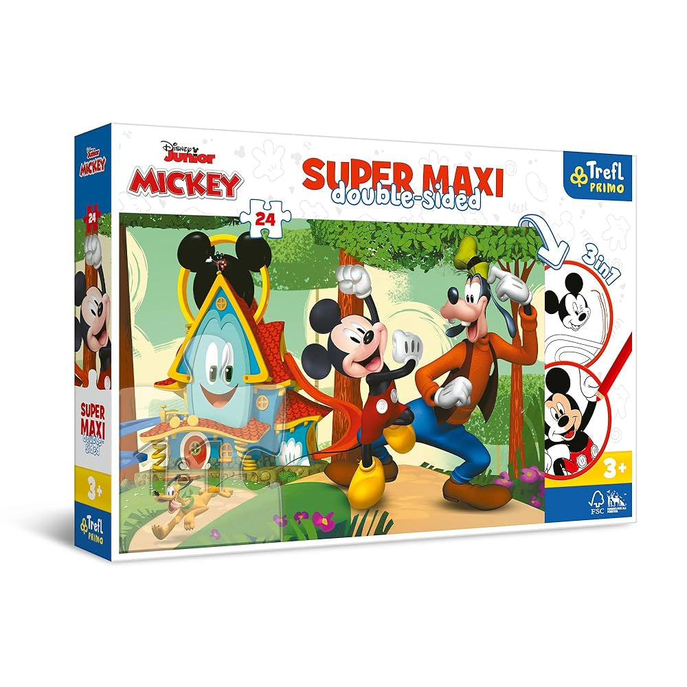 بازل أطفال بتصميم شخصيات Mickey Mouse وجوفي، مكوّن من 24 قطعة كبيرة الحجم (سوبر ماكسي) وسهل التركيب. البازل مزدوج الوجهين، وجه بصورة ملوّنة ممتعة ووجه آخر مخصص للتلوين، يساعد الطفل على تنمية التركيز والمهارات الحركية والخيال، مناسب للأطفال من عمر 3 سنوات فأكثر.