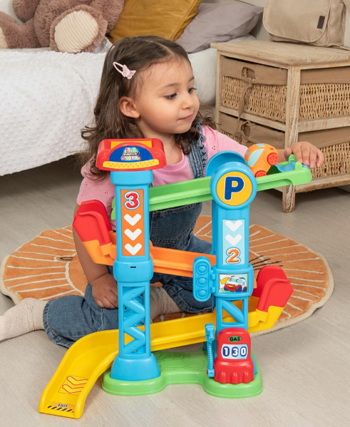 برج لعب متعدد المستويات بتصميم مرح وألوان زاهية، يتيح للطفل وضع السيارة في الأعلى لتتدحرج عبر المسارات حتى تصل إلى الأسفل بطريقة ممتعة. يتضمن مركبة واحدة ضمن العبوة، مع منحدرات متدرجة وأجزاء سهلة التركيب تناسب الأطفال من عمر سنة إلى أربع سنوات. يوفر تجربة لعب تعتمد على الحركة والانزلاق داخل المنزل، مع تصميم آمن بحواف ناعمة مناسب للصغار.