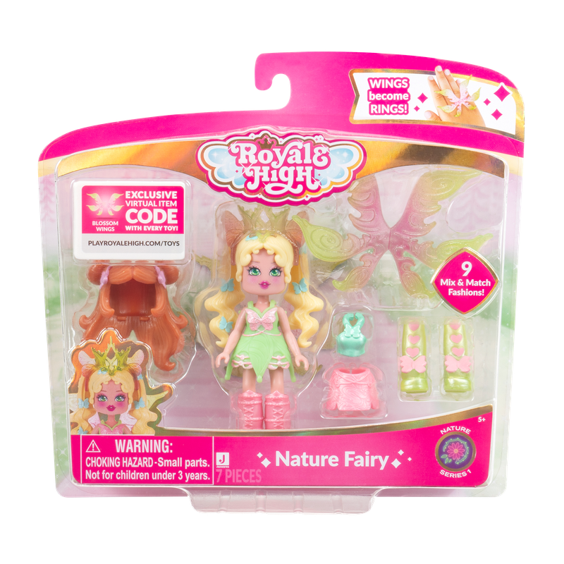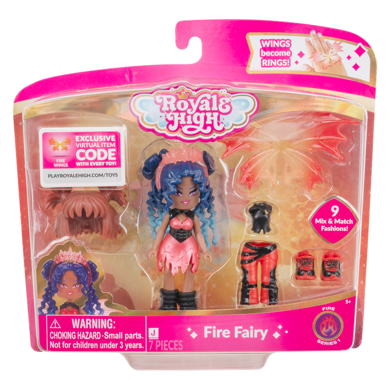 مرحبًا بكم في عالم رويال هاي الساحر! باعتبارها أكبر ملكية قائمة على الموضة في الألعاب، تدعوك رويال هاي لاستكشاف عالم افتراضي مليء بالموضة والأناقة. تأتي الدمى المستوحاة من اللعبة بحجم 3 انش مع تسعة أزياء لتنسيقها كما تصبح أجنحة الجنيات خاتمًا يمكن ارتداؤه! تمثل خمس جنيات من السلسلة 1 كل منها عنصرًا، بما في ذلك الظلام والجليد والنار والضوء والطبيعة. تحتوي كل دمية على رمز لعبة UGC قابل للاسترداد لإكسسوارات جنيتك في جميع التجارب. مرخص رسميًا.