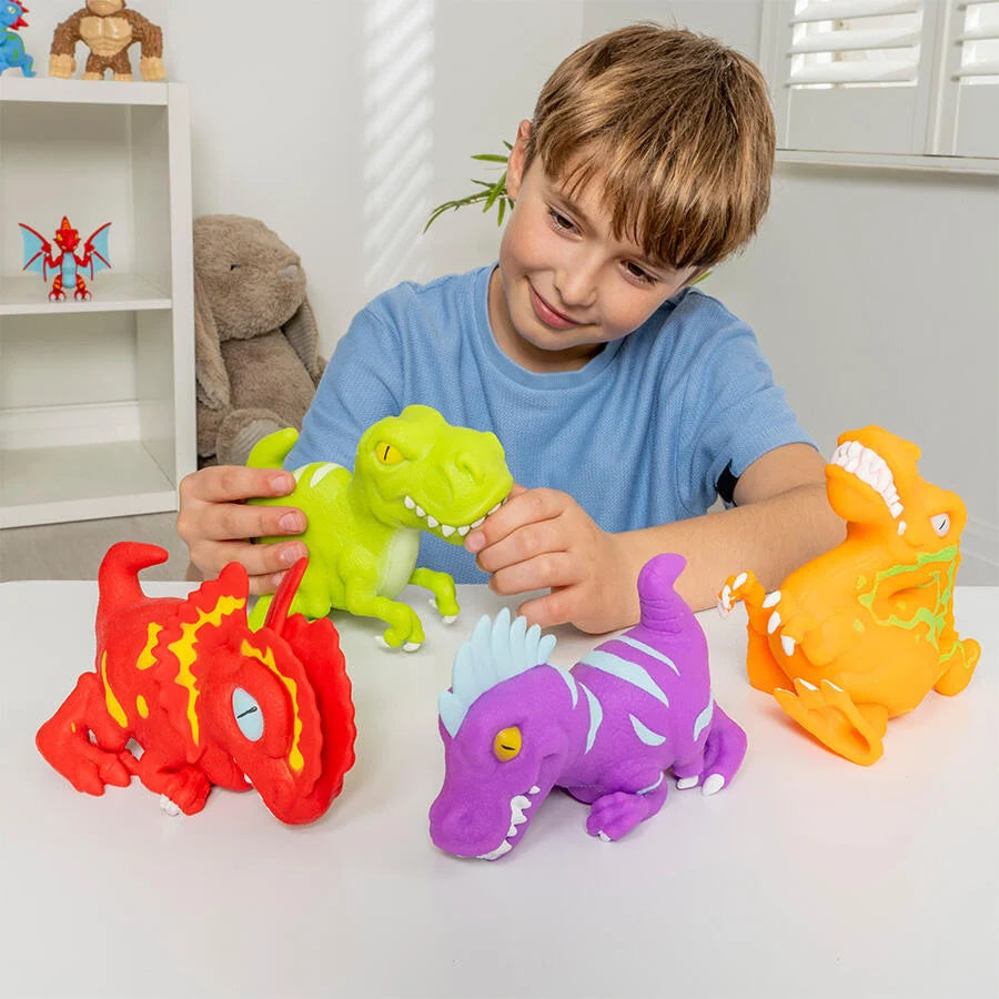 شخصيات ديناصورات بتصميم مميز وألوان متعددة، مصنوعة من خامة مطاطية قابلة للتمدد والضغط ثم تعود إلى شكلها الأصلي. تتميز بتفاصيل واضحة مستوحاة من أشكال الديناصورات المختلفة، ما يمنح الطفل تجربة لعب تعتمد على الشدّ والتشكيل. متوفرة بعدة موديلات يمكن جمعها، ومناسبة للعب داخل المنزل.