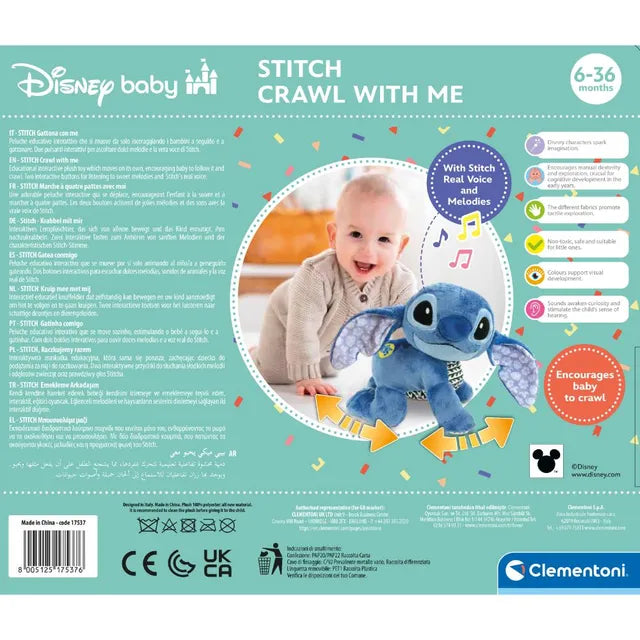 دمية ستيتش المحشوة المسلية تُعلّم الأطفال خطواتهم الأولى في العالم! هذه اللعبة المحشوة الممتعة هي أيضًا مركز أنشطة مزود بزر تفاعلي يُفعّل صوت ستيتش الحقيقي وألحانه! ستيتش يزحف بالفعل، مما يُساعد الطفل على تطوير مهاراته الحركية من خلال اللعب المُحاكي. صُممت لعبة ستيتش الزاحفة لتشجيع الطفل على البدء بالزحف وتقليد حركاته. اكتشف جميع منتجات كليمنتوني المرخصة من ديزني!